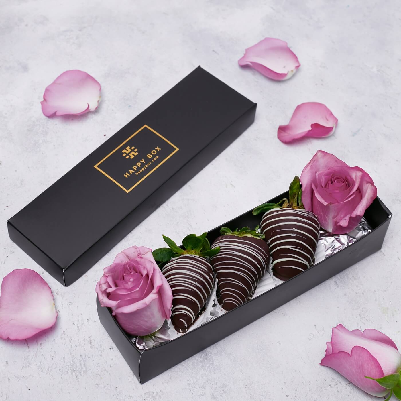 Add a touch of happiness to your order with this little mix of decadent strawberries and fresh roses. Big treat in small packaging!