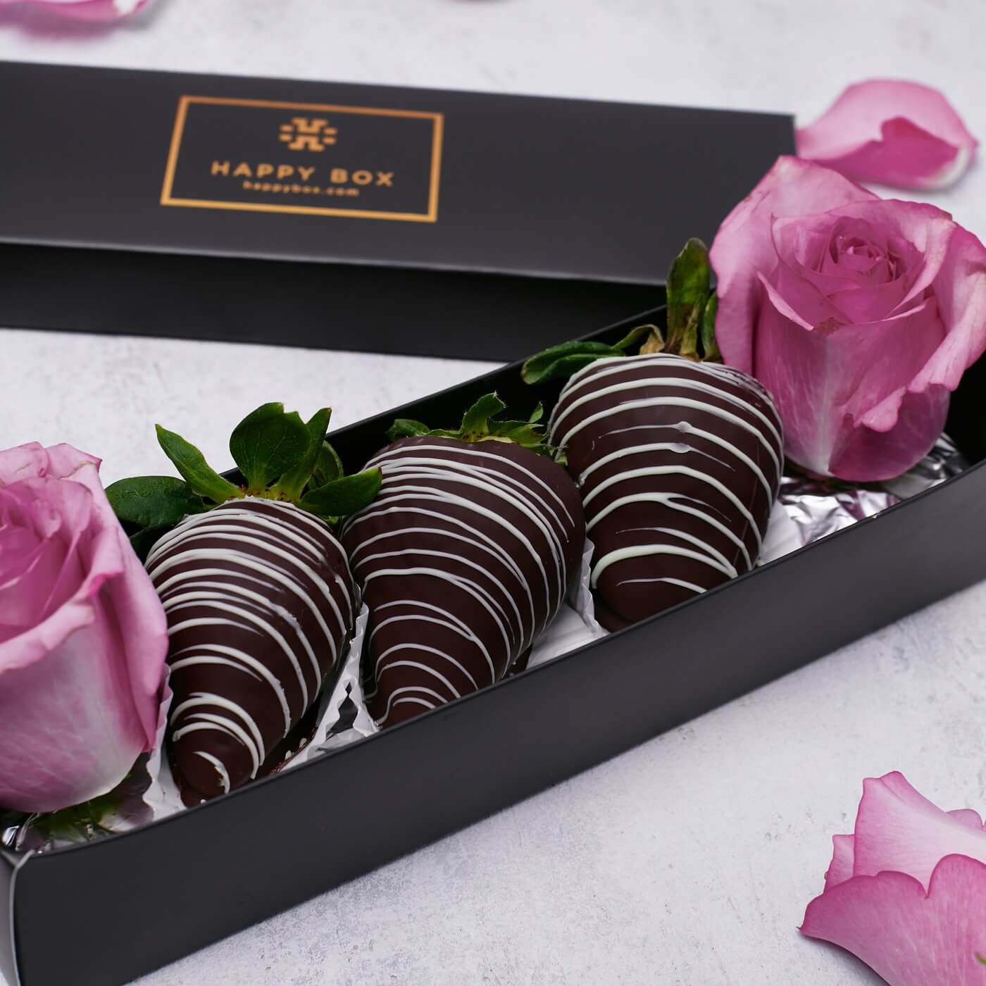3 juicy strawberries dipped in Swiss dark chocolate, nestled with 2 fresh purple roses.