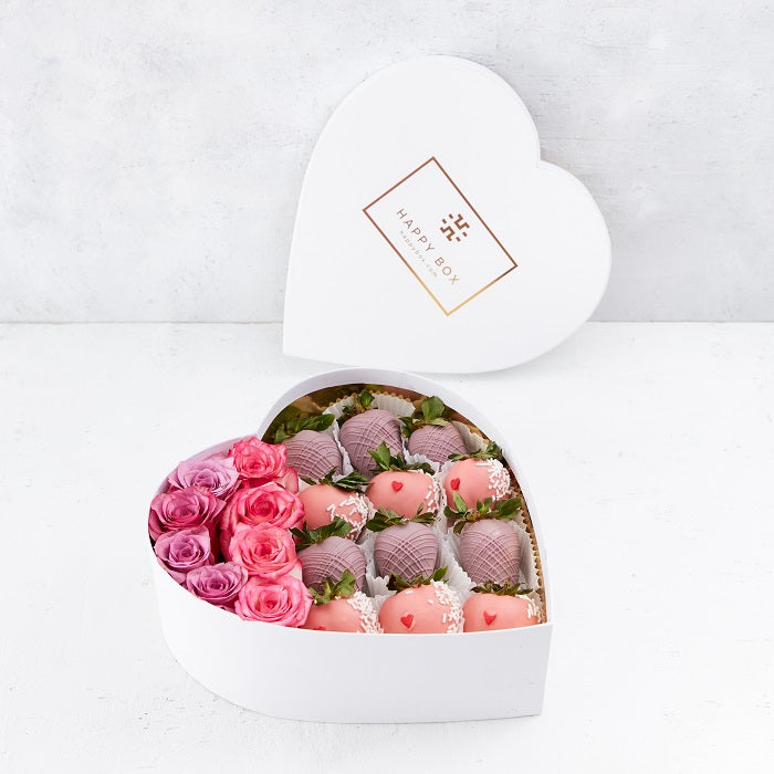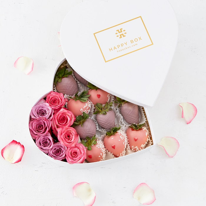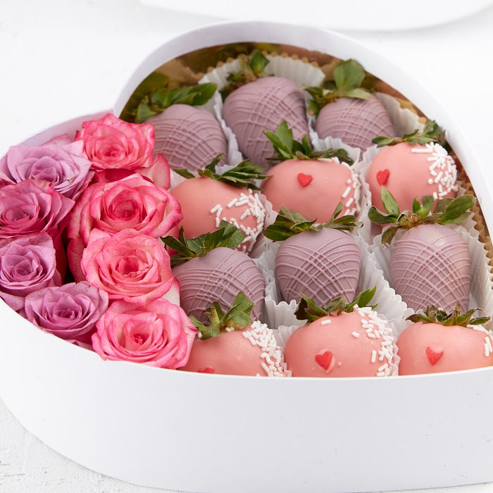 Discover passion and pleasure in one decadent place. This heart-shaped box holds a fresh bouquet of pink and purple roses nestled among juicy strawberries dipped in rich swiss chocolate.