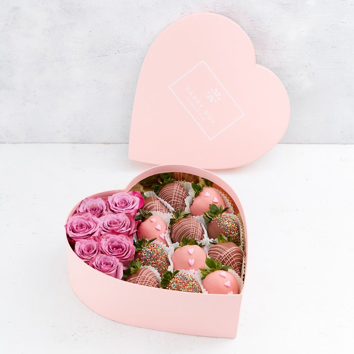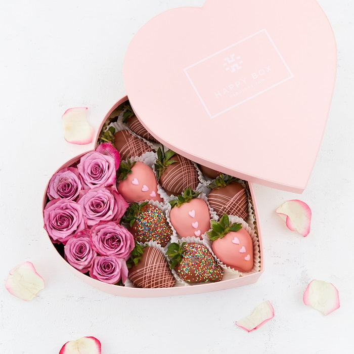 Discover passion and pleasure in one decadent place. This heart-shaped box holds a fresh bouquet of roses nestled among juicy strawberries dipped in rich swiss chocolate .