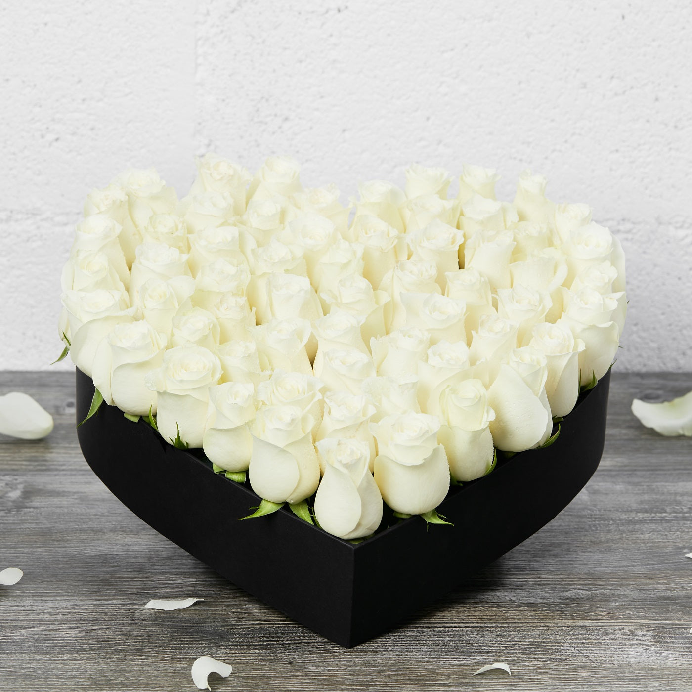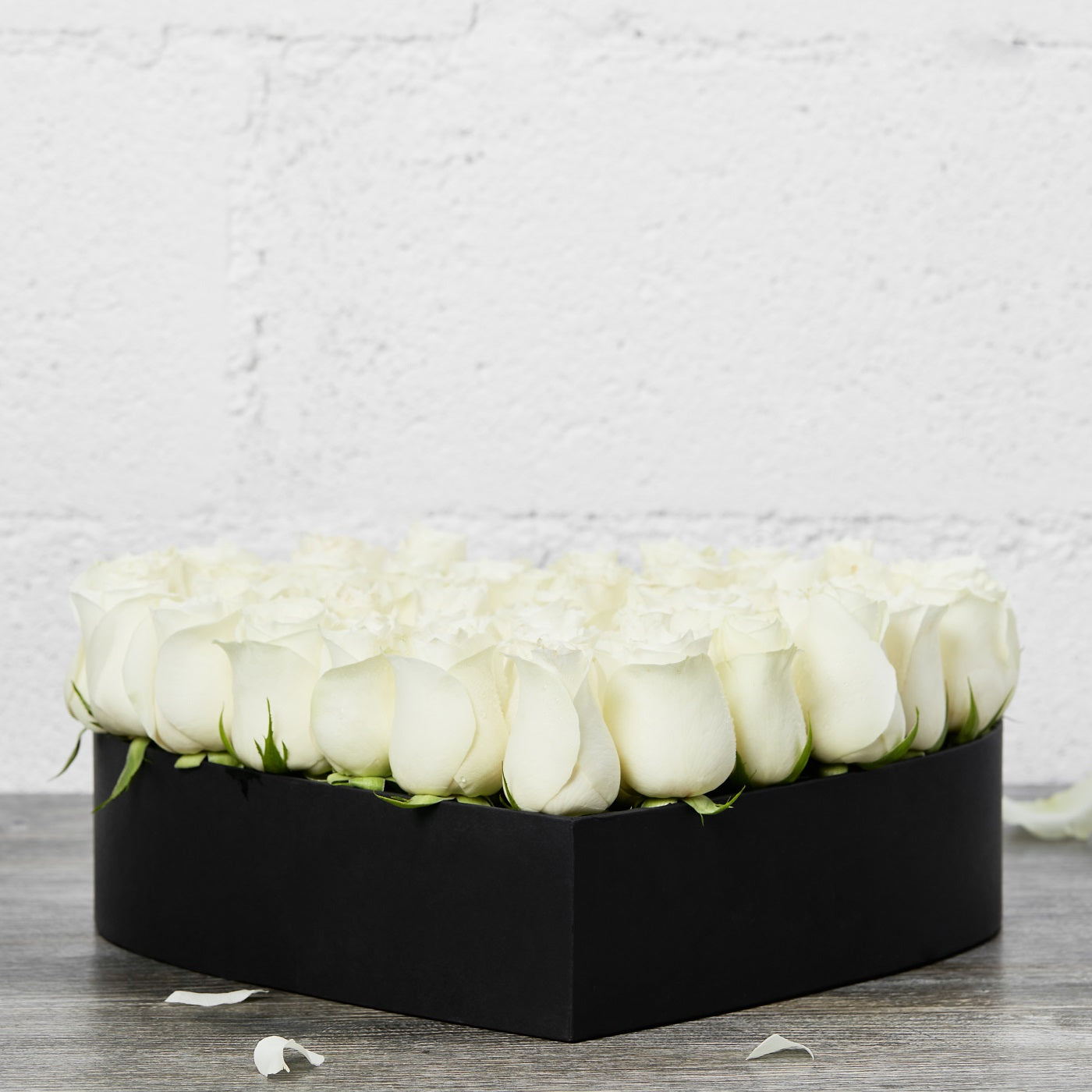 The perfect gift for the Sweetheart in your life. Uncover a romantic heart-shaped gift box with fresh white roses.