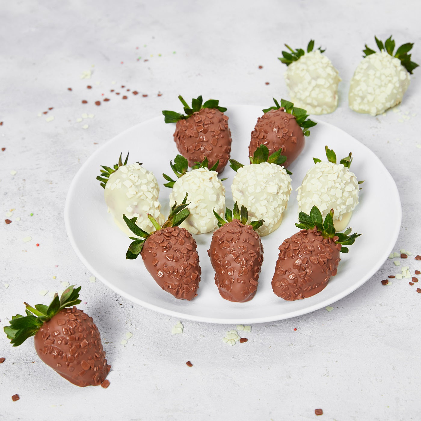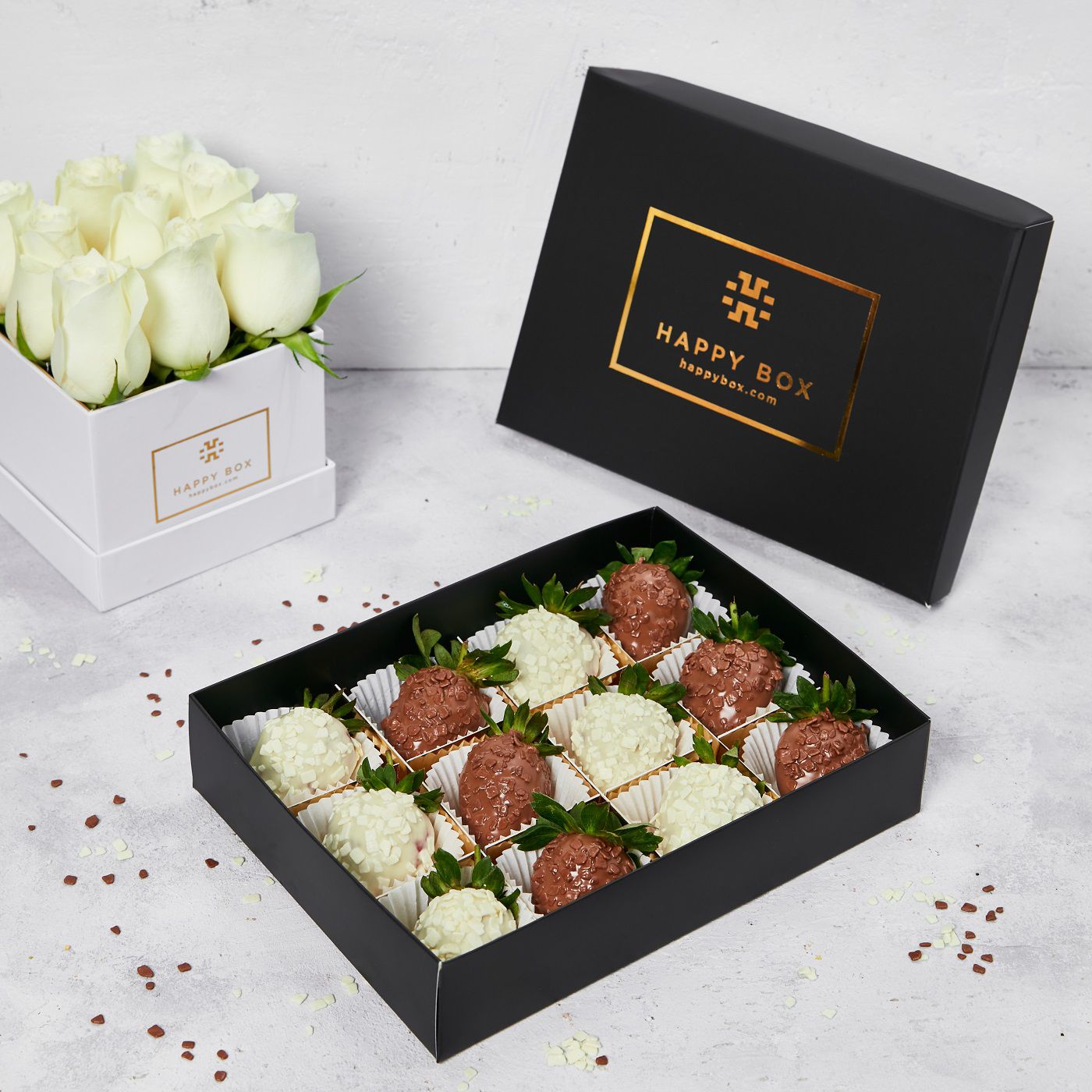 Swiss chocolate dipped strawberries with white and brown chocolate chips in a gift box.