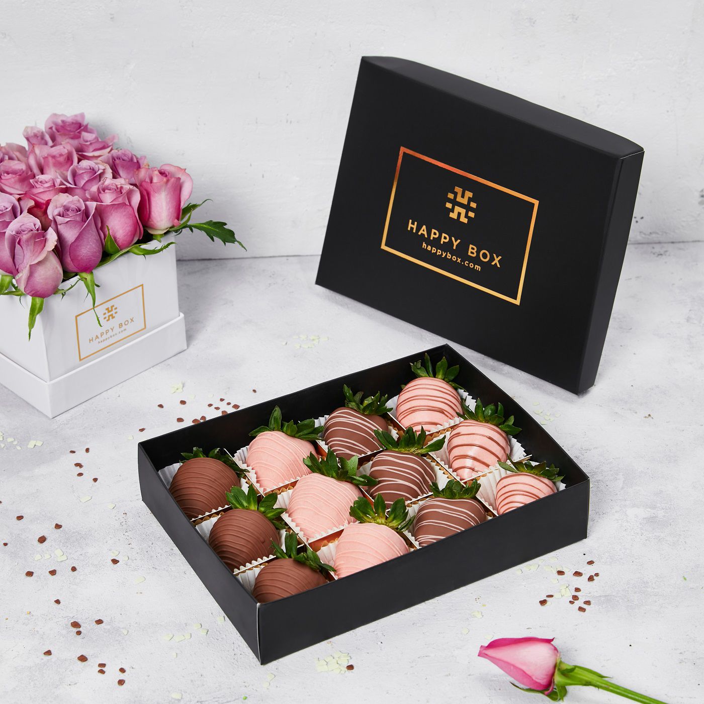 The prettiest strawberries in town. Wow someone special with these mouth watering milk and white pink swiss chocolate dipped strawberries. Discover pure bliss with every bite.