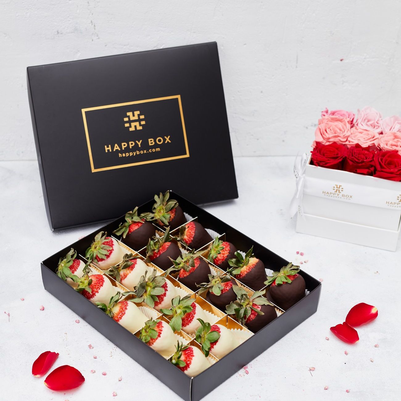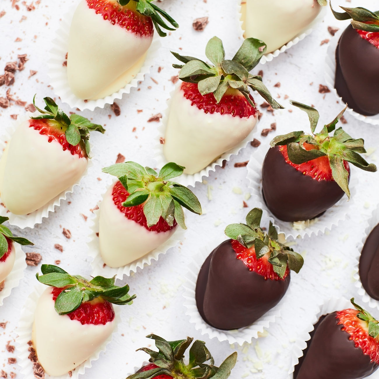 Indulge in our delicious gourmet strawberry selection. Comes in a box, strawberries dipped in dark and white chocolate.