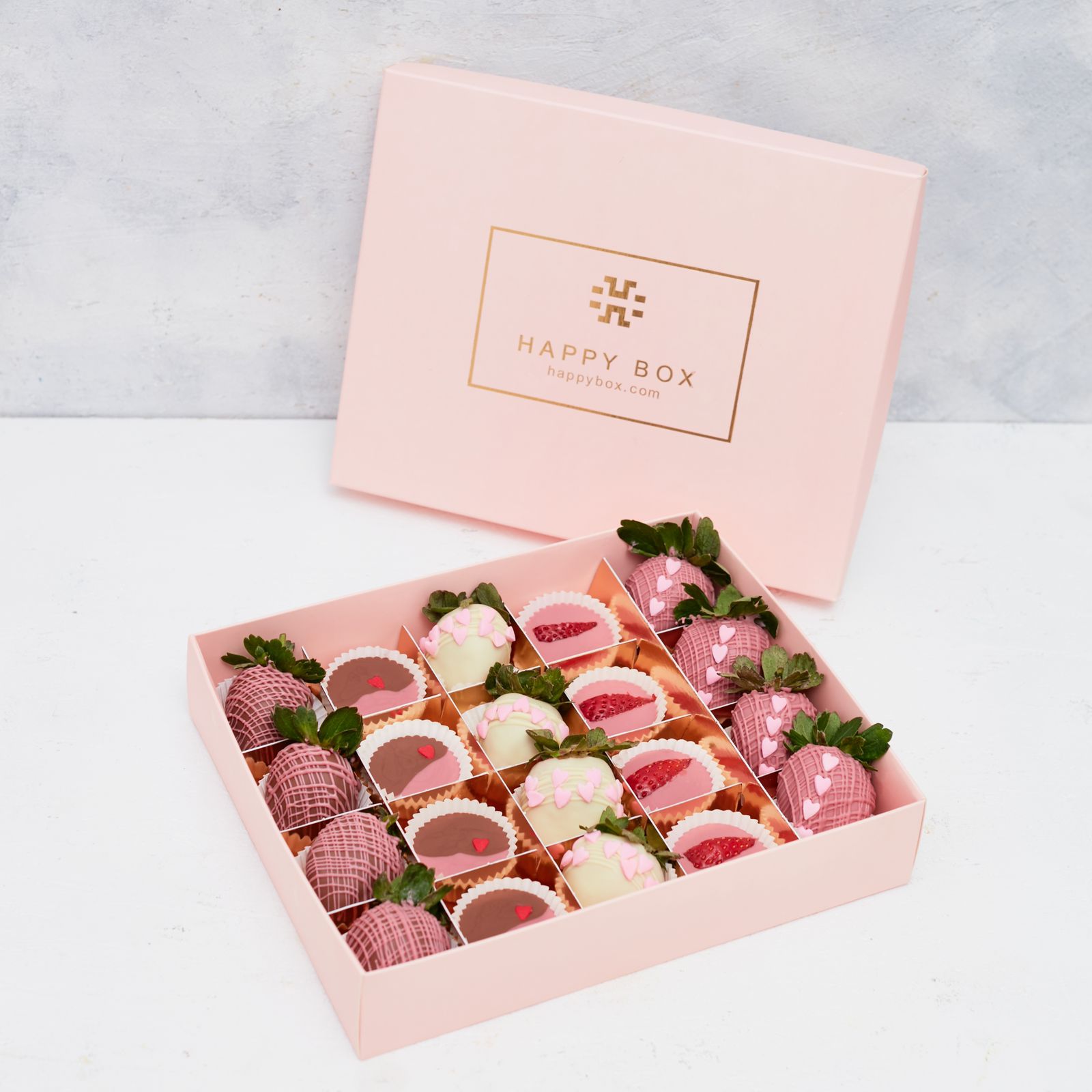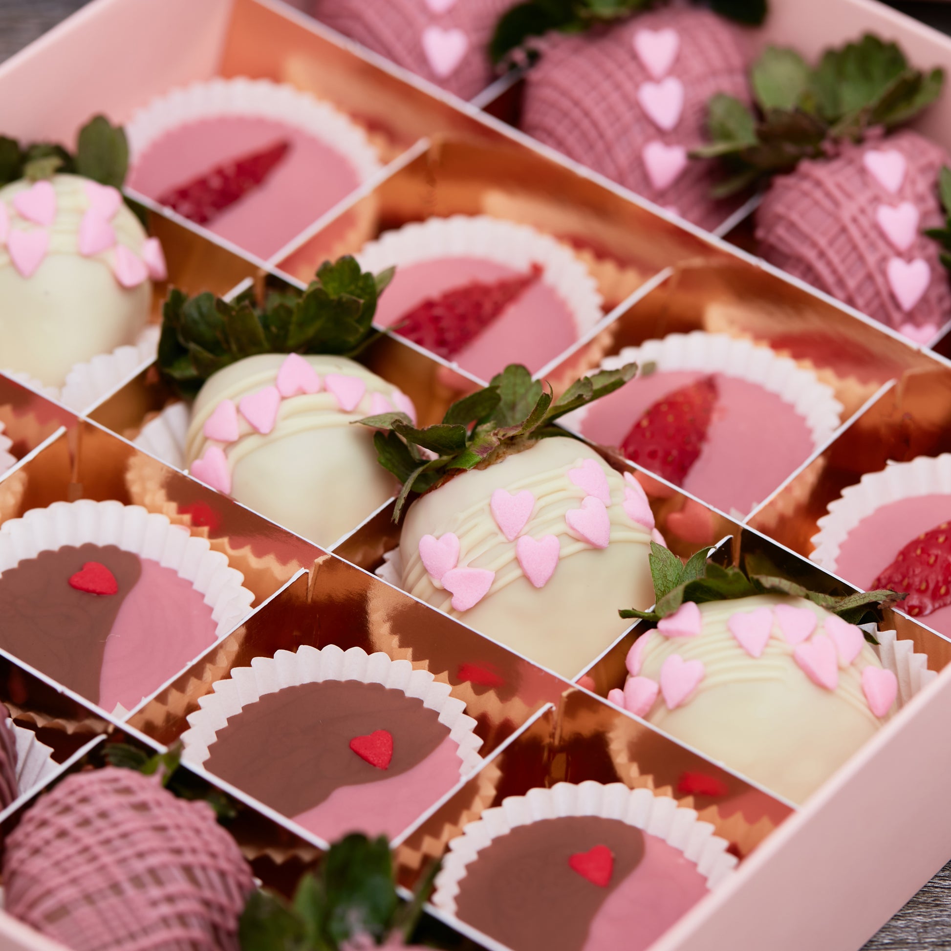A box of pure treats! Enjoy our freshly chocolate dipped strawberries, nestled with our custom swiss chocolate cups. Almost too pretty to eat!