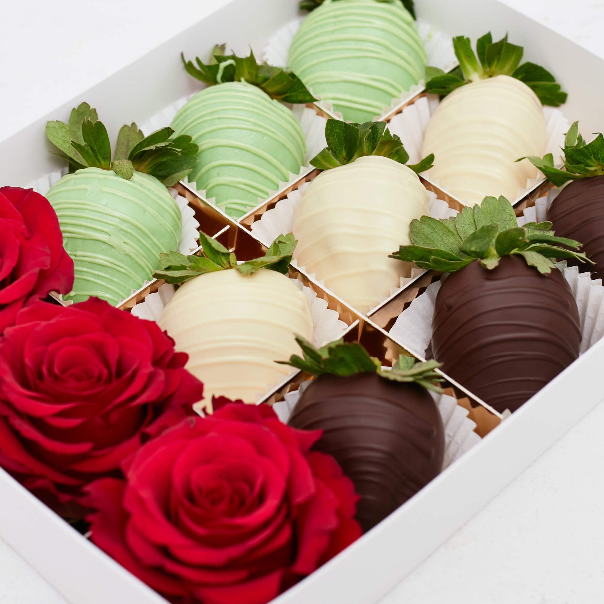 Celebrate the UAE everyday with our custom flag box, delicious Swiss chocolate dipped berries nestled amongst fresh red roses. Commemorate in style!
