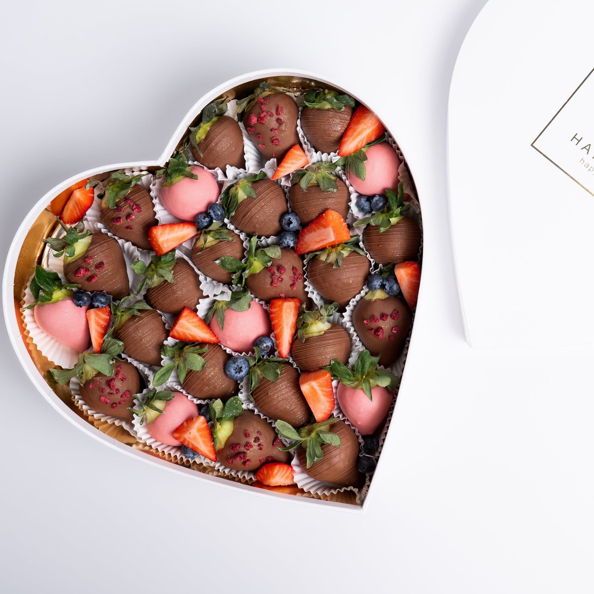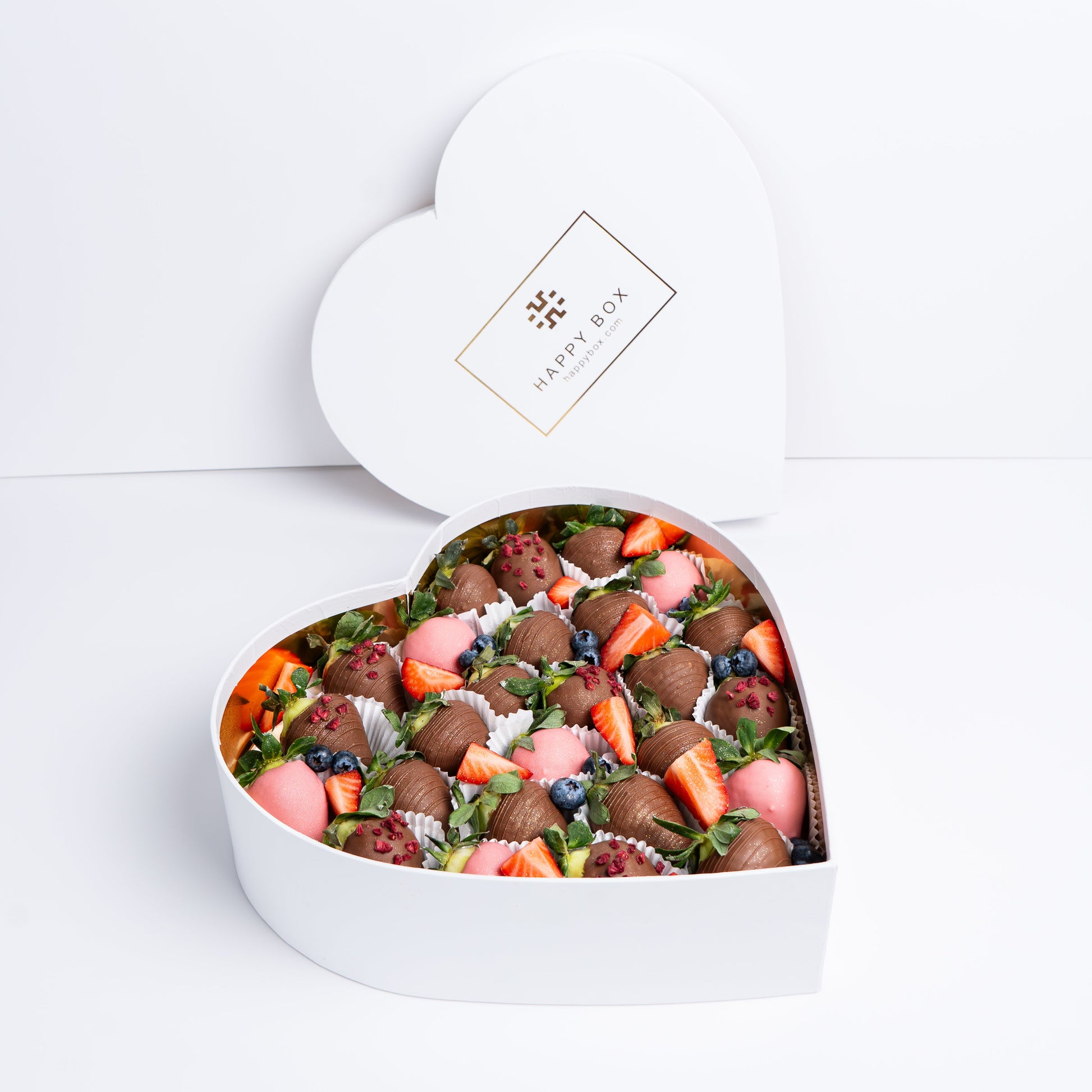 A heart-shaped box filled with luscious strawberry chocolates and indulgent blueberry treats, combining the rich sweetness of strawberries with the delightful burst of blueberries, creating a perfect symphony of Flavors for a truly decadent experience.