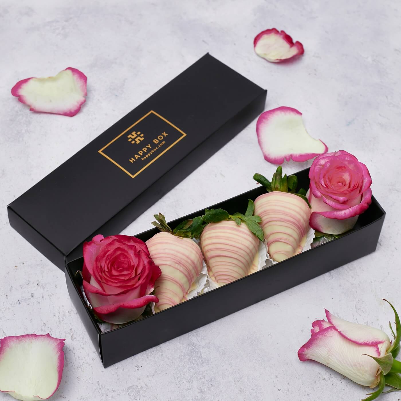 Add a touch of happiness to your order with this little mix of decadent strawberries and fresh roses. Big treat in small packaging!